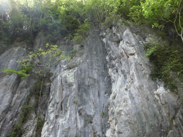 石面刻字という記念刻字で昭和7年 天見線起工記念の文字。7年に及ぶ難工事の苦労讃え16mの大きさで刻まれています。