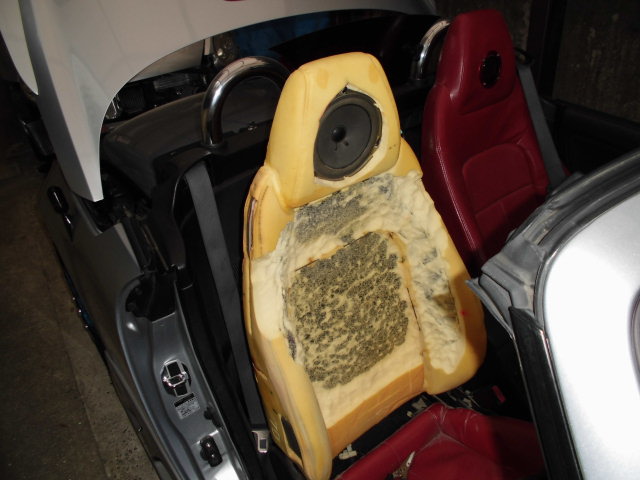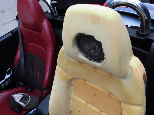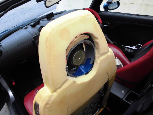 前説が非常に長くなりましたが、ヘッドレストスピーカーなんて言っても簡単で、ロードスターのヘッドレストスピーカーを参考に(なってませんが)ヘッドレストのウレタンをくり抜いてスピーカーをぶち込むという荒っぽい手法です。