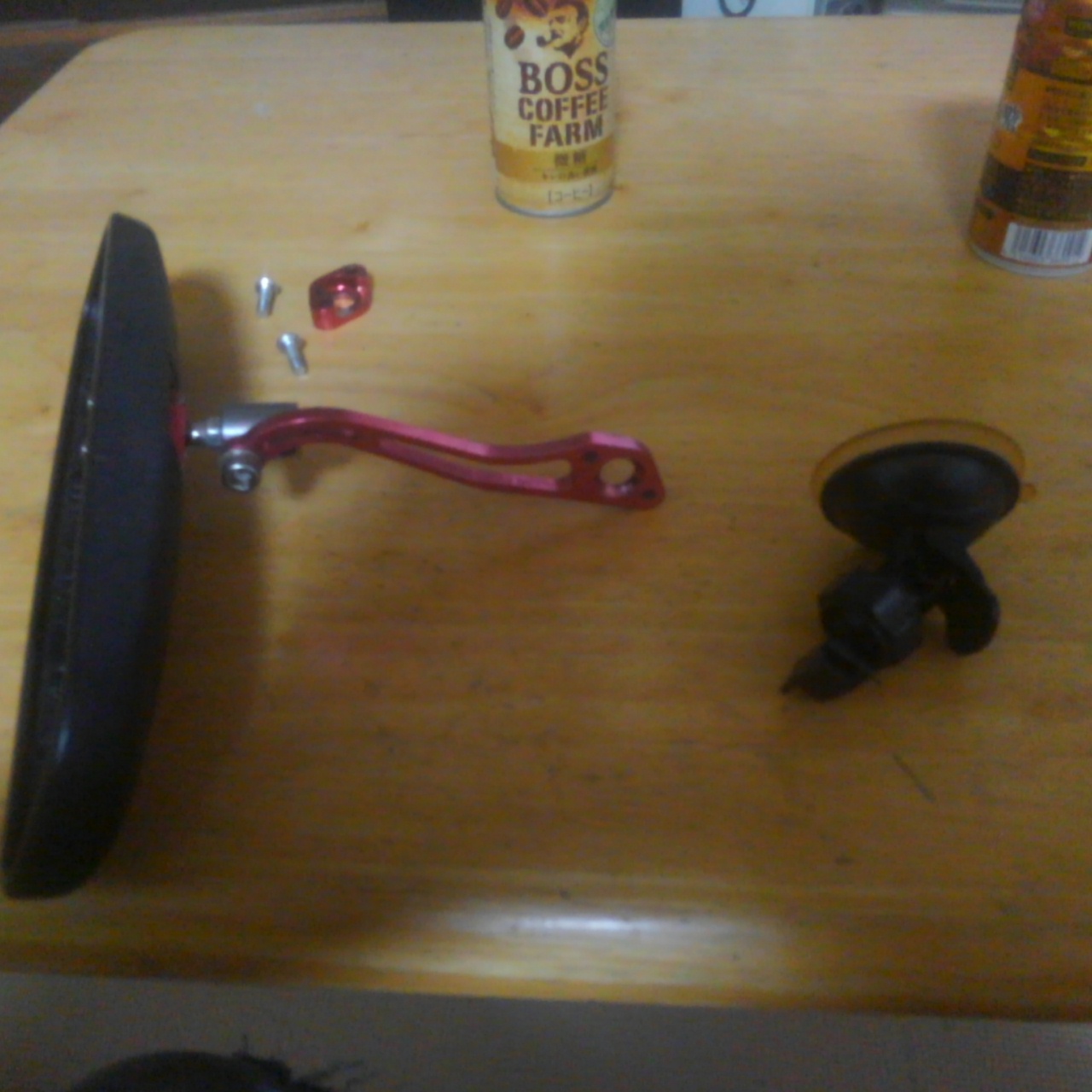 以前ルームミラー一体型レーダーを付けるのに使用していた純正ミラー改と吸盤台座で製作していきます。