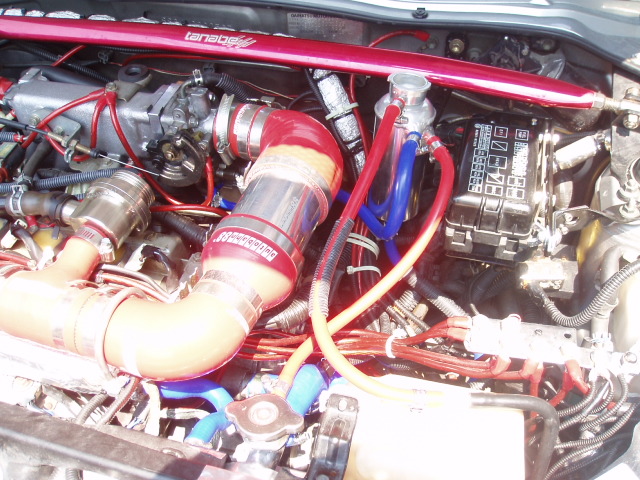 赤やら青やら統一感の無いエンジンルームですなぁ。