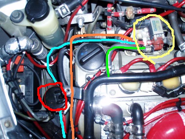 本来コペンのこの部分には何も無く、ちょうどエンジンヘッドカバーに沿うように金属の配管(オレンジ線)が取り付けられ右上の部品VSV(バキュームスイッチングバルブ)に接続されています。(黄色丸)