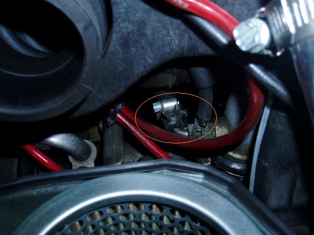 画像赤丸部分が、アクチュエーターに来ている配管の接続部分で、ホースクランプで固定していますが、純正はラジオペンチで摘めるクランプですので、摘んで奥へ押し込むように外します。