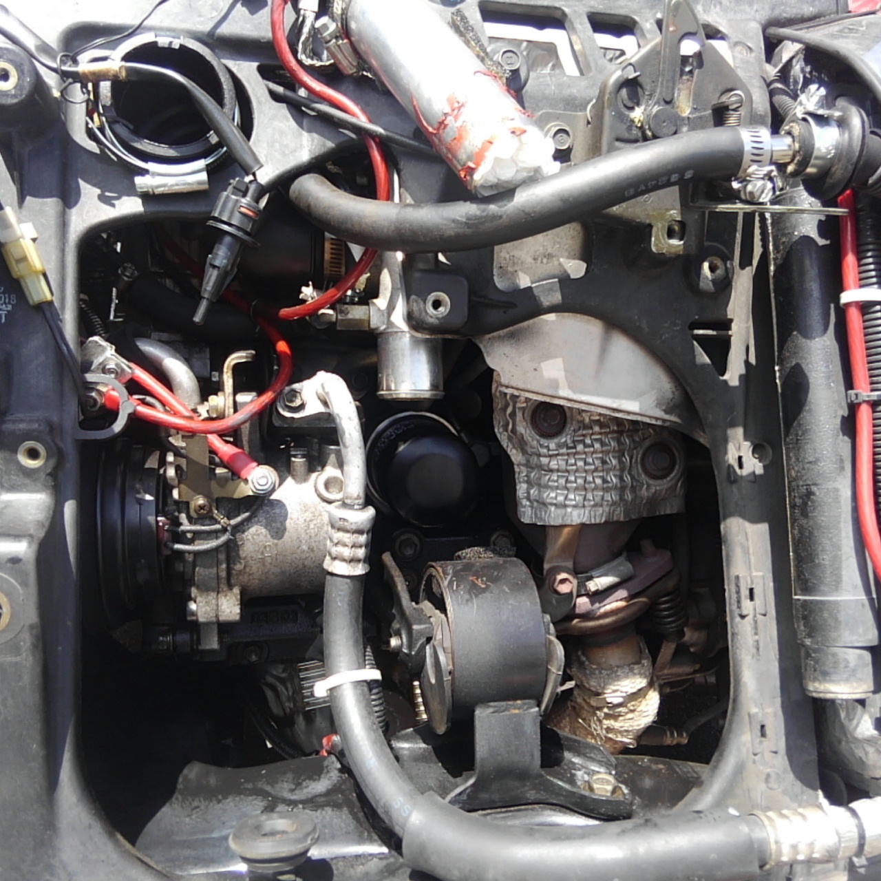 と、いって上に行こうとするとタービン、横はエアコンコンプレッサーに阻まれ、、、、。