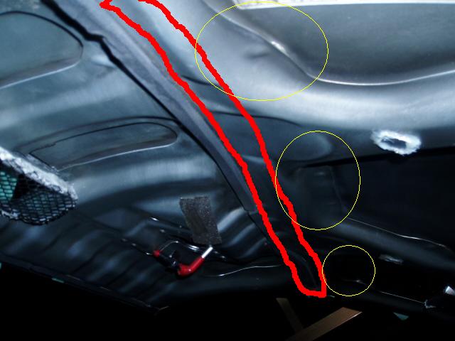 下の画の赤で囲った部分が、ちょうどボンネットと接するコアサポート上部分で、黄色丸位置はコアサポート裏側部分。