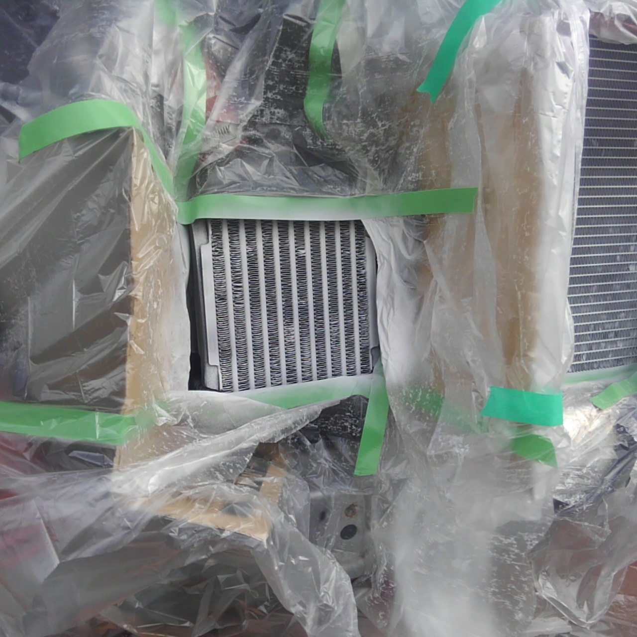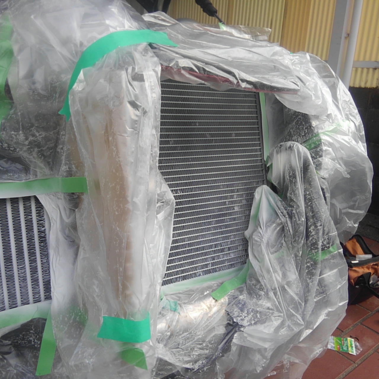 ただ、いくらなんでもスプレー塗装だけでエアコンコンデンサーを外す訳にもいかず車載状態でそのまま表面のみ吹き付けしていきます。