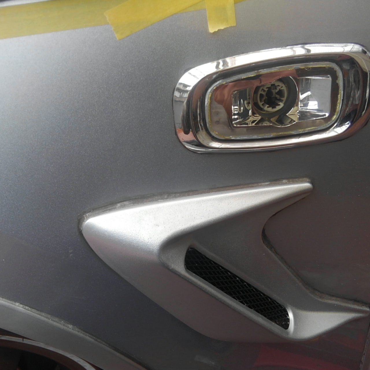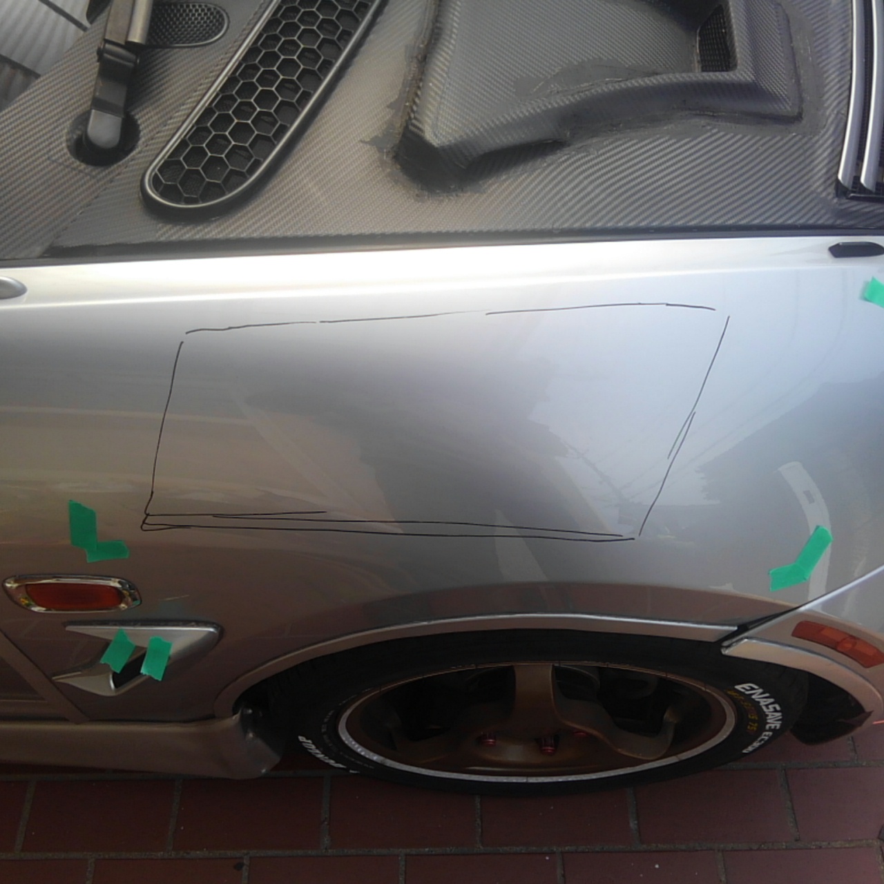 前日ピカピカにしたフェンダーでしたがダクト部分の入り込む箇所をカットするので大体の位置を出します。