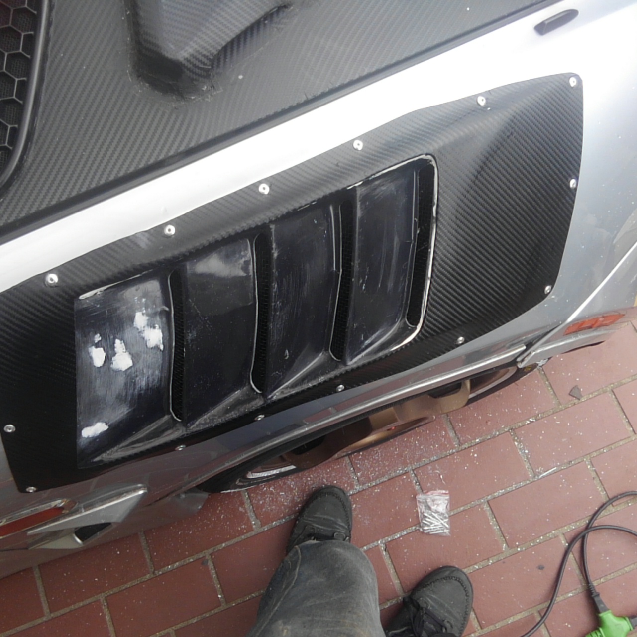 今回これも初めてでしたが「ハンドリベッター」を使っての車体への固定でしたが今までのボルト&ナットより全然楽に作業できますし数回使用すれば使い方もマスターできました。ボンネットダクトやサイドステップの時に知っていれば、あんなにフィッティングで苦労したりパテ盛りしまくらなくて済んだのに、、、。