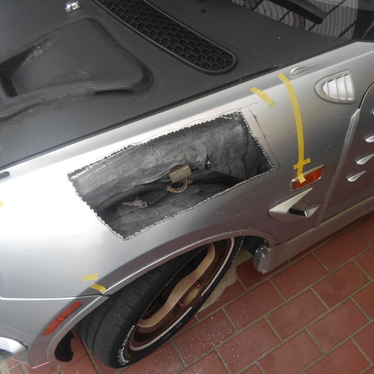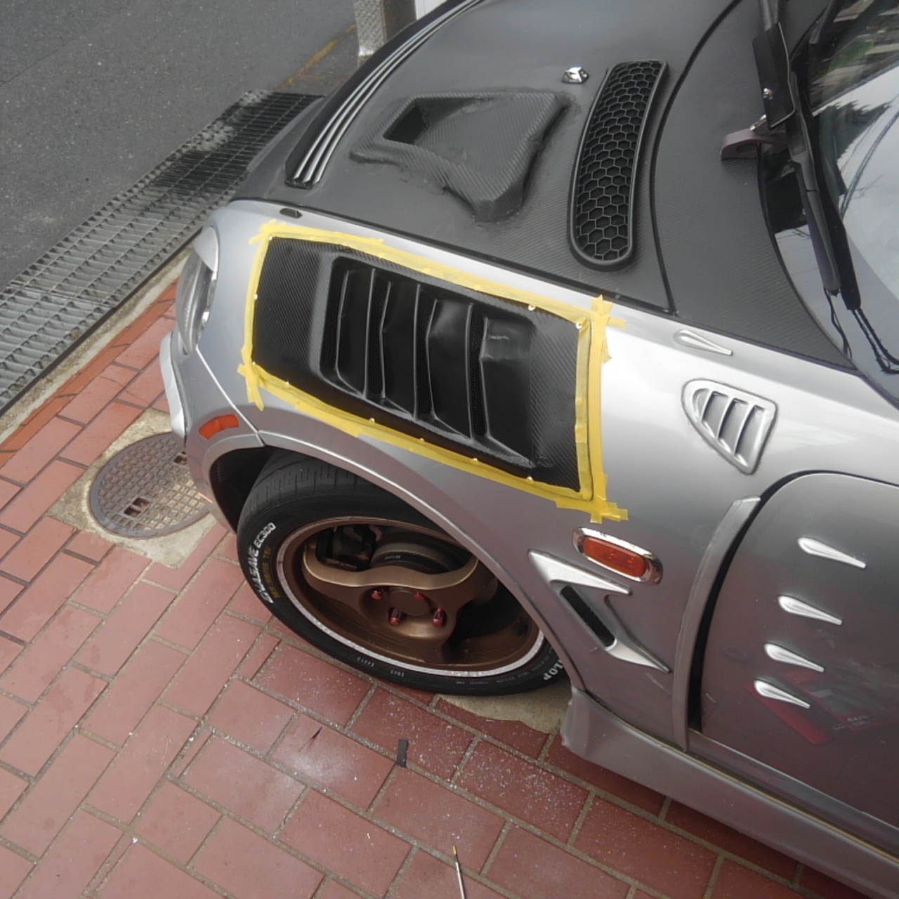 以前エンジンルームの熱対策、フロントリフト改善などでフェンダーに小細工してきましたが、今回ガッツリと開放しちゃいまして熱対策最終章とするべくフェンダーダクトを増設してみました。