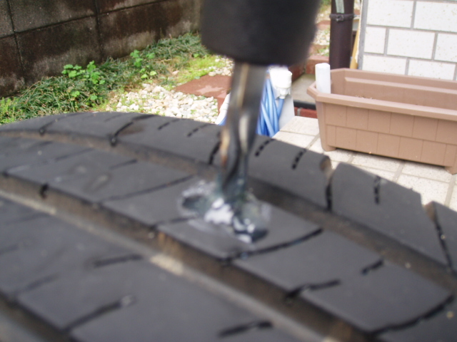 気が済んだら、根元まで押し込んだら一度右に回しながら半分程度スクリューリーマーを抜き出し、タイヤに刺さっているスクリューリーマーに再度エコセメントを塗りつけます。