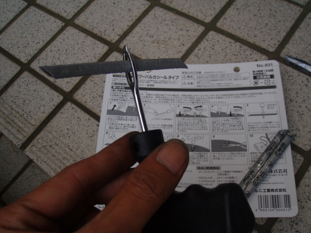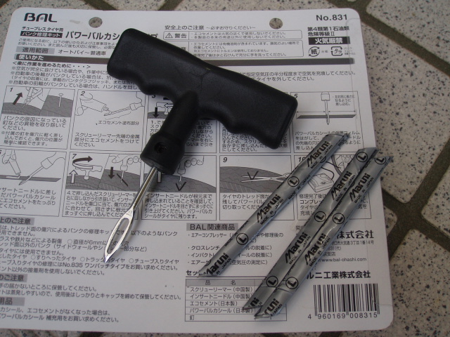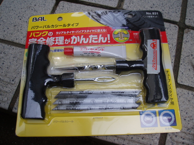 普通車、バイク用で「パワーバルカシール」という特殊構造のナイロン繊維と未加硫ゴムで出来たモノをパンク穴に突っ込んで修理するモノで、チューブレスラジアル・バイアスタイヤ用。