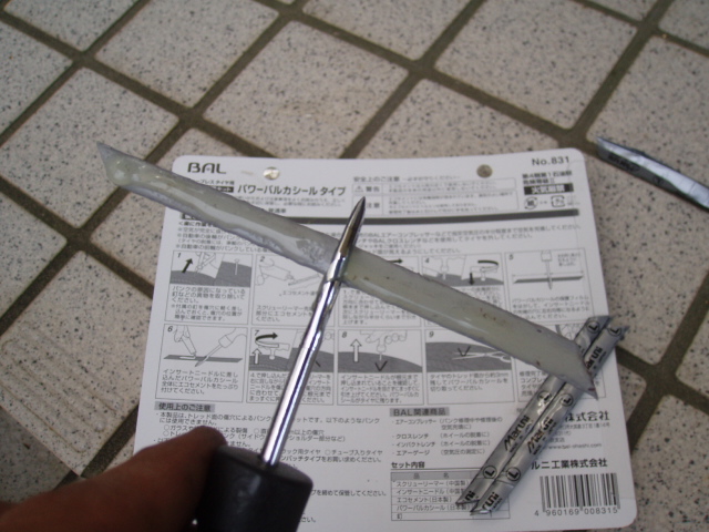 スクリューリーマーはタイヤに刺して栓にしておいて、パワーバルカシールを準備します。