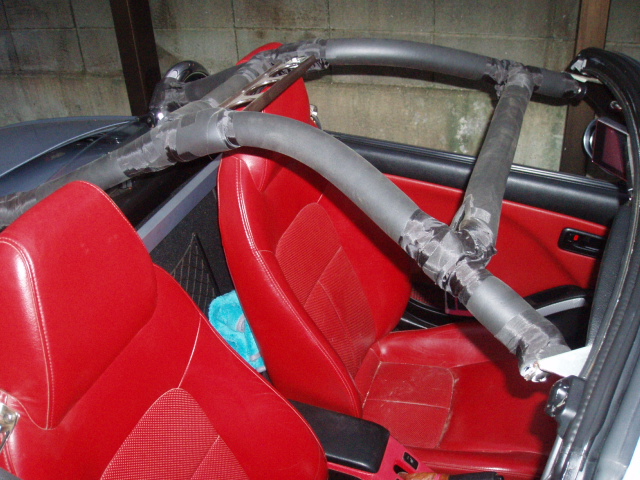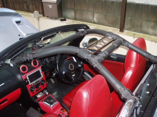 真っ直ぐなパイプで製作できない事も無いが、ルームミラー上部を横切るようにパイプを通して取り付け部分を確保する必要があり、さらに後方のファッションロールバー部分の取り付けも工夫がいる。