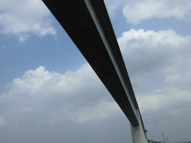 「くの字」の理由ですが、付近に大きな造船所があり航路を塞ぐように橋脚を設置できなかった為らしいですが、実際に橋を走行してみると「くの字」という形状がよくわかって非常にユニークな橋です。