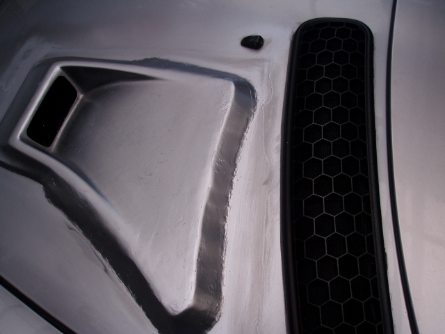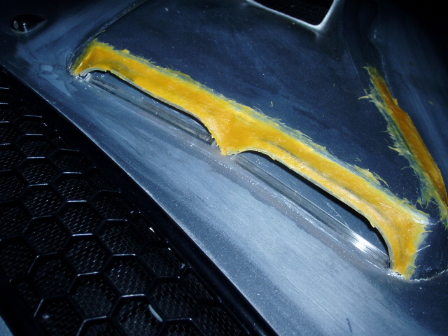 最初はダクトを取り外してピッタリボンネットに沿って取り付ける予定でしたが、 折角苦労して盛り上げた形状ですから、この形を生かす改良方法がないかな、といろいろ案を練っておりました。