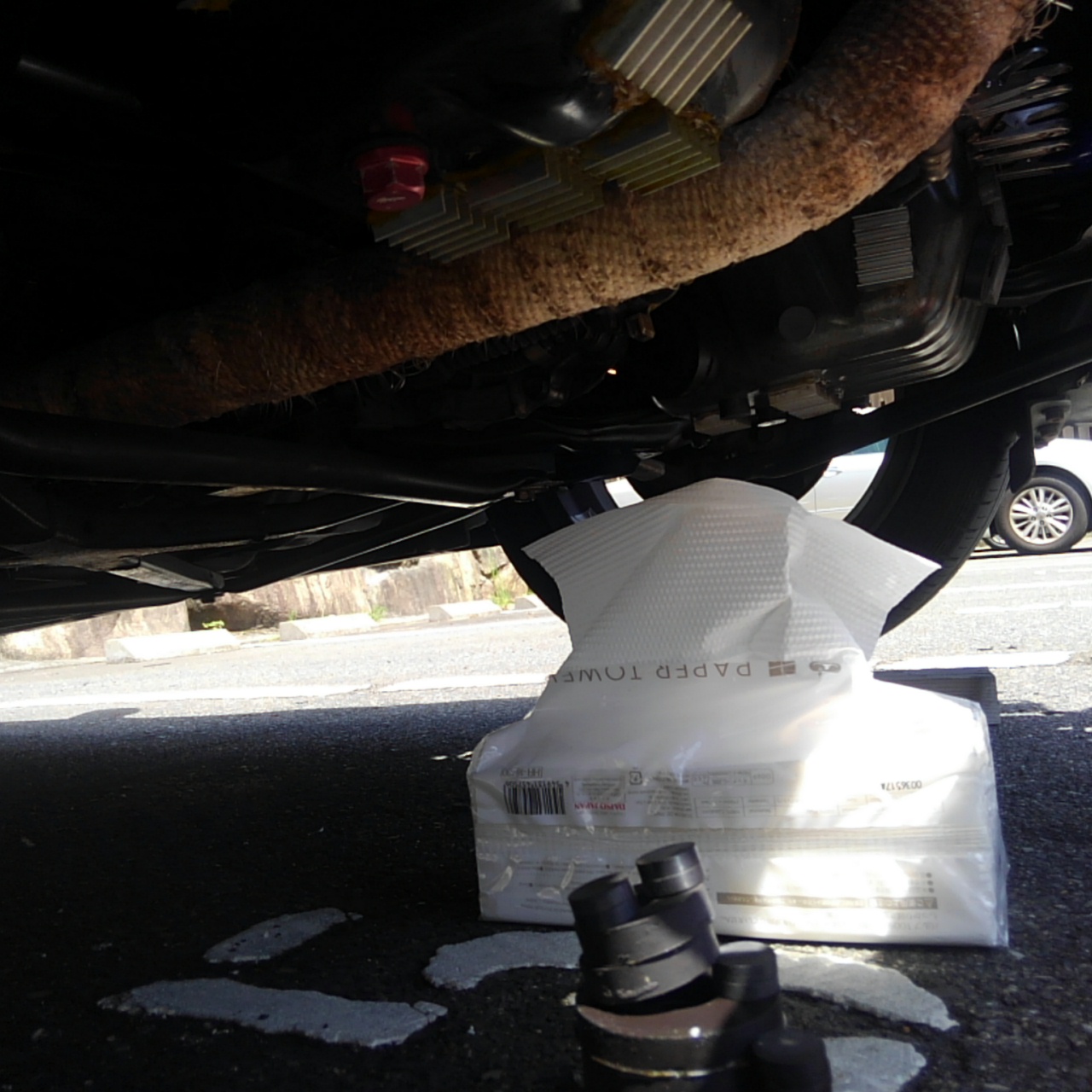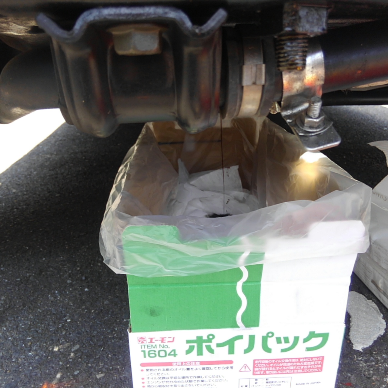 バンパー脱着開始より1時間経過、オイルを抜きながら暫し休憩しつつ作戦を練ります。