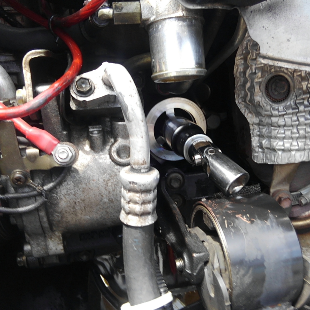 と、いって上に行こうとするとタービン、横はエアコンコンプレッサーに阻まれ、、、、。