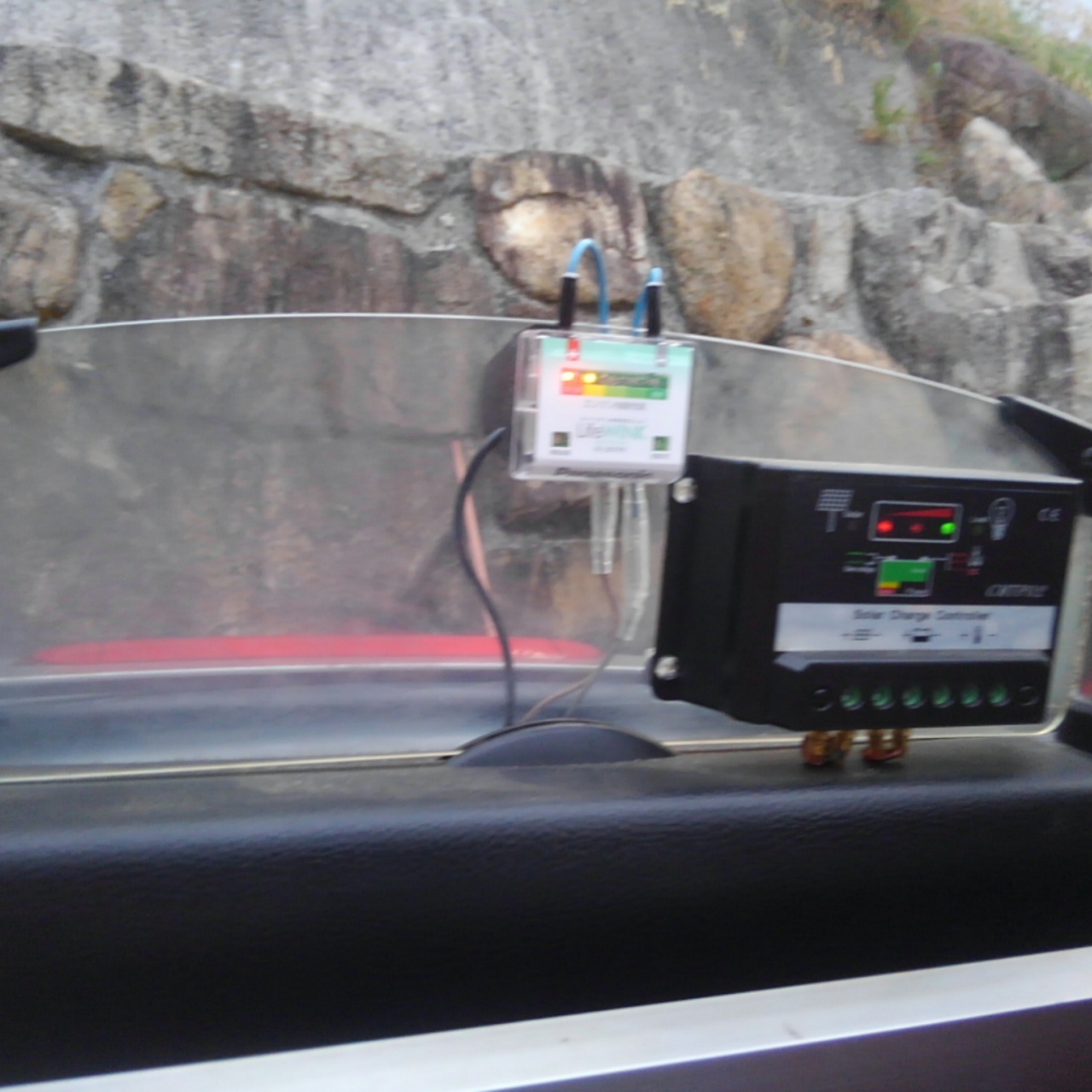 取り付け場所はウィンドウディフレクターにソーラーパネル充電制御ユニットと並べてみました。