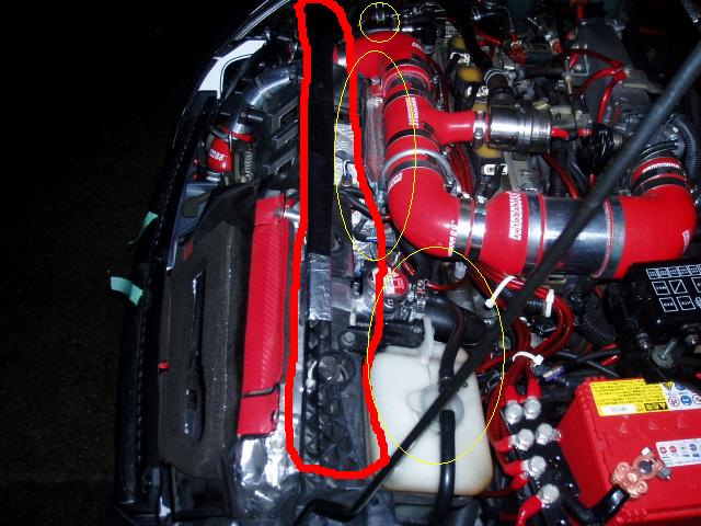 ダクト取り付けの理想・希望的な位置は、このラジエターコアサポートとエンジンの間の空間です。