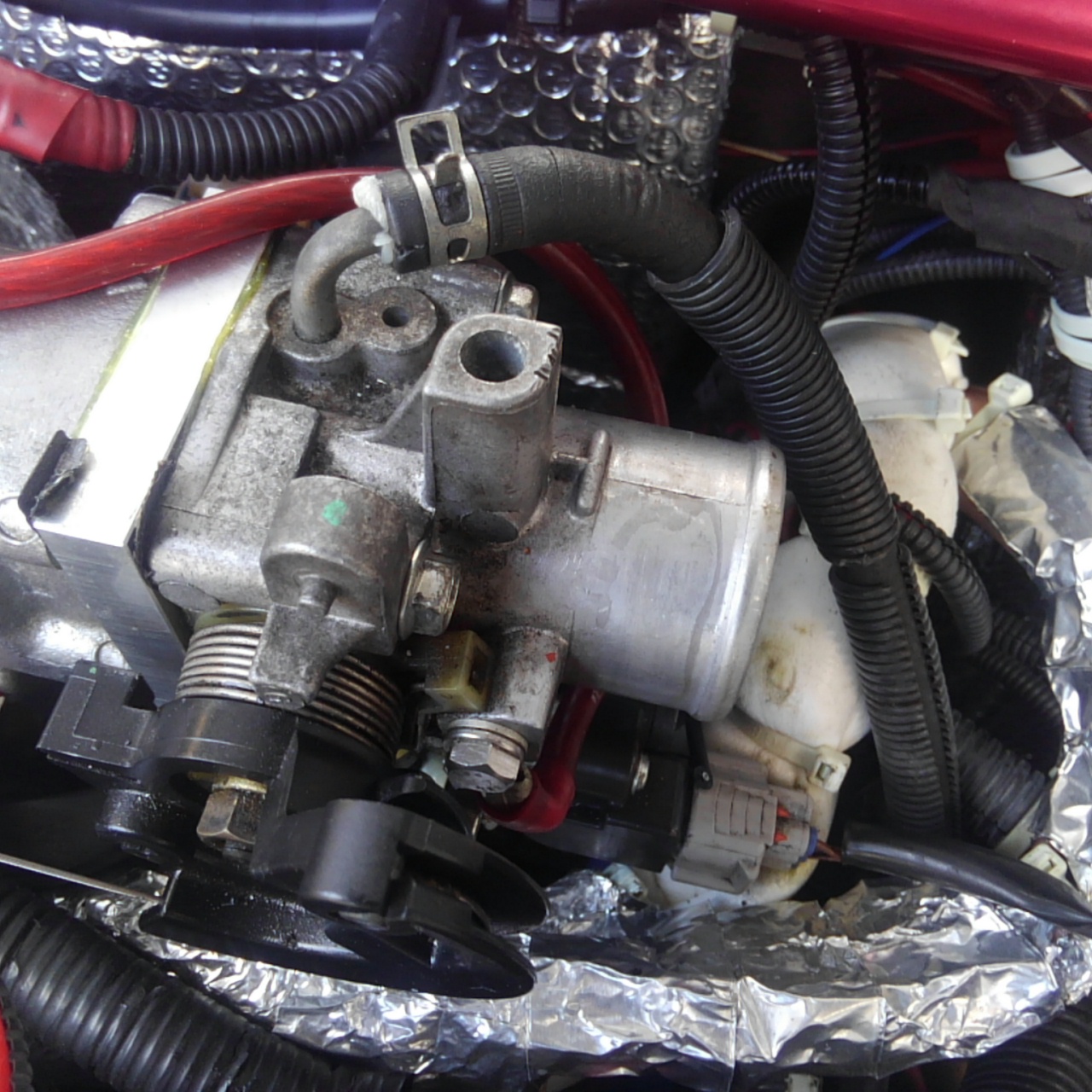 スロットルボディには冷却水の経路があったりアイドリング関連の穴もあるんで下手に穴開けられません。