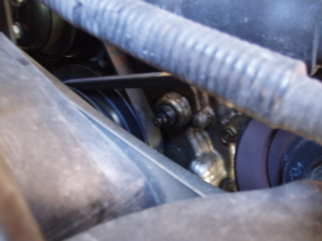 こいつを外さない事にはどうしようも無いので、手持ちの工具でなんとかしようとしましたが、ボックスレンチが入らないしエアコンベルトが邪魔になるしで正直交換作業は無理、簡単にはいきません。