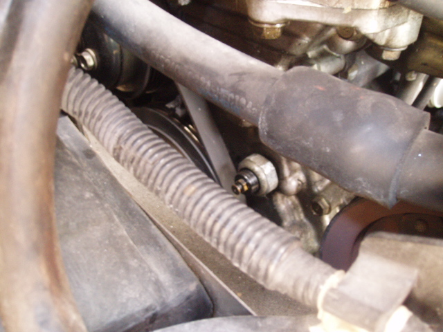 見え難いですが、コルゲートチューブでカバーしてある油圧センサーの延長ホースの奥にオイルプレッシャースイッチがあります。