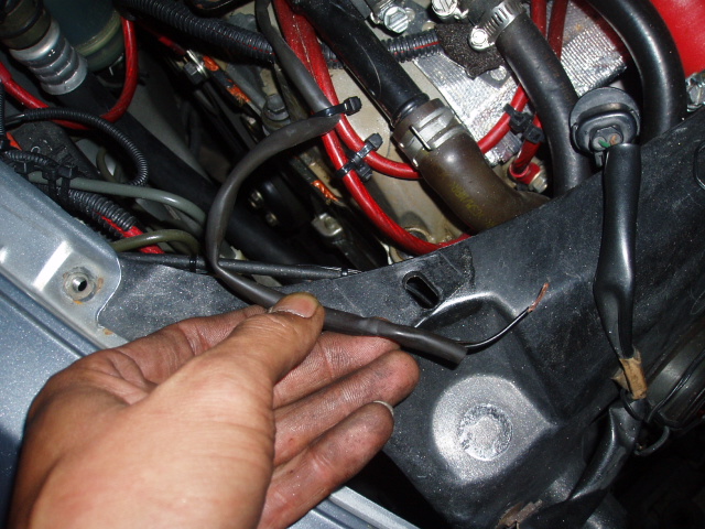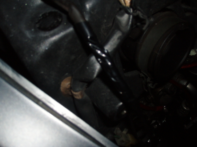 オイルプレッシャースイッチ用の配線ですが、ブローオフバルブからの戻り配管の横に配線が通っています。グレーのビニール?カバーされた配線ですのですぐわかるとおもいます。