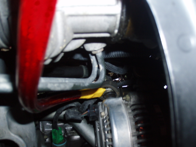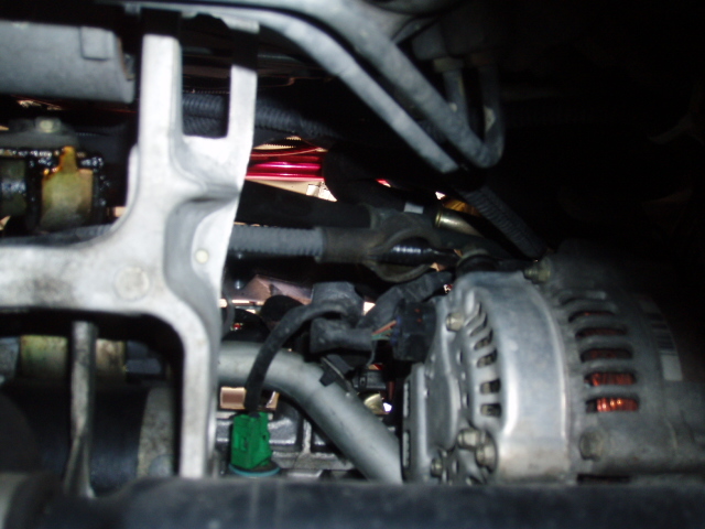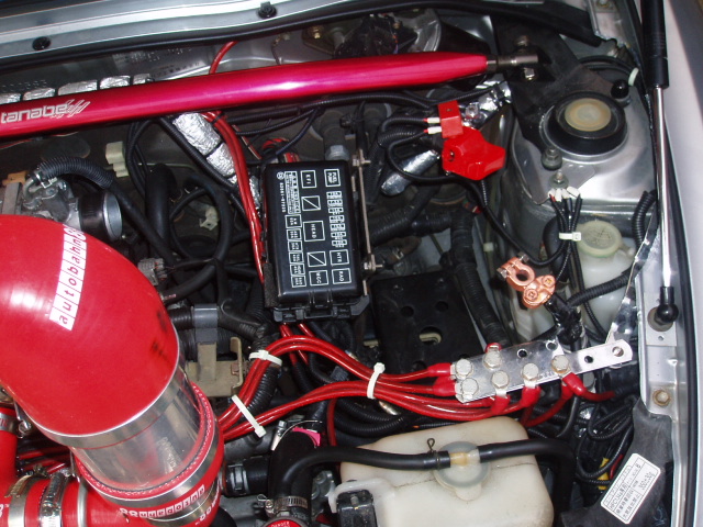 赤がオルタネーターから、黒(マイナスのケーブル)がバッテリー跡地から
