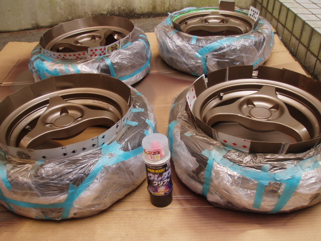 ホイール4本をクリアー1本で吹きますので、数回に分けて吹きます。