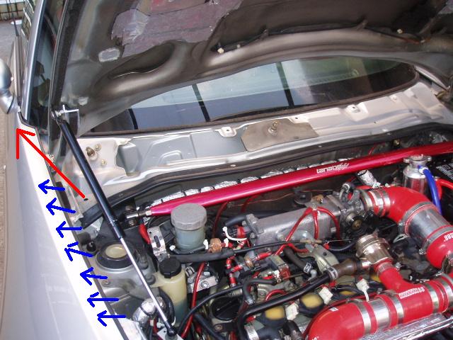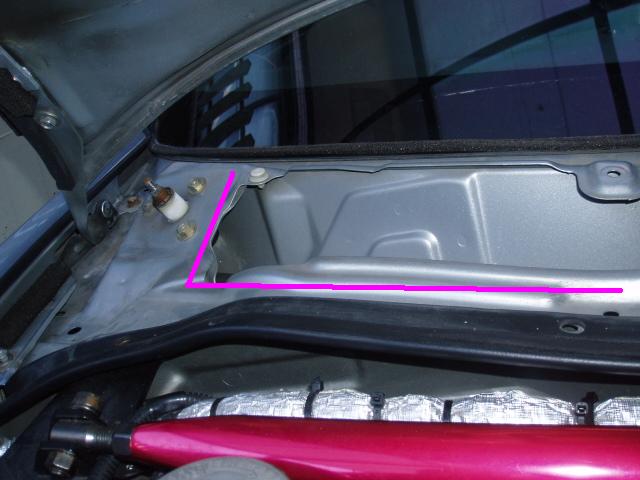確認してみると、赤矢印は貫通していますがボンネットヒンジ部分下から?になります。